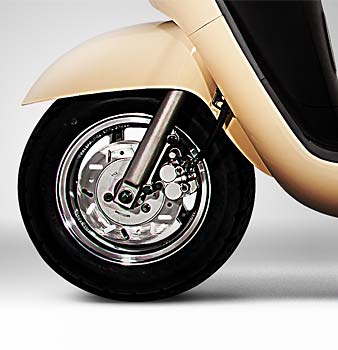 Braking is achieved through sport-tuned, 190 millimeter disc brakes up front, and 110 millimeter drum brakes in the rear. The brakes stop the scooter fast, with an extremely short braking distance. And the 10-inch wheels provide excellent control on any kind of road surface.